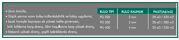 Polyester keçe taşıyıcısının modifiye bitümle doyurulması sonucunda elde edilir. Yalıtım membranları bir yüzü polietilen, diğer yüzü arduvaz taşı, alüminyum ve polietilen film lamine edilerek üretilmektedir. Teras, temel uygulamaları ve tüm su yalıtım detaylarında uygulanabilir. PP katkılarının bitüme kazandırdığı düşük sıcaklıkta bükülme ve esneklik değerlerini, yapı ömrü boyunca muhafaza eder.